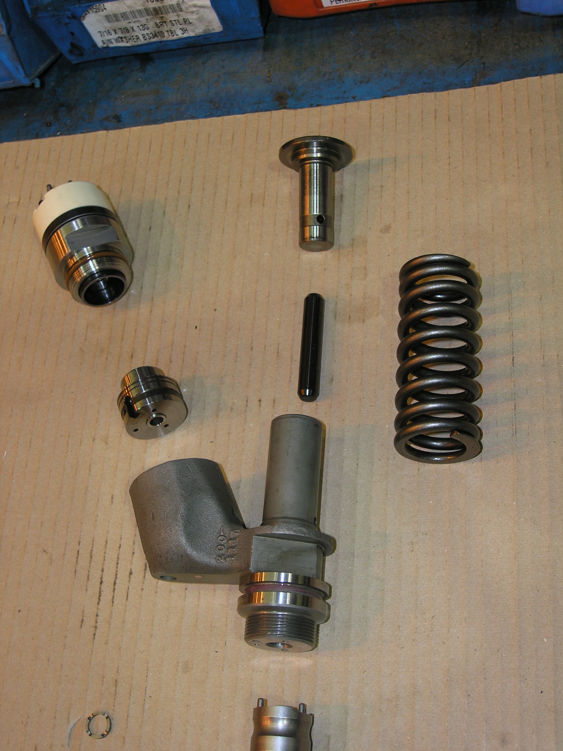 The pump body has several functions. It contains the housing for the solenoid assembly (the part pointing to the left in the photo), the mounting for the injector nozzle assembly (the threaded section at the bottom of the pump body) and the high pressure injector pump.